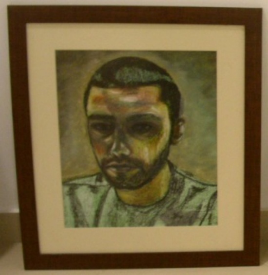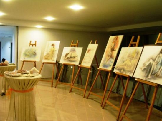 On the second floor of the new modern building of the Gönyeli Municipality, I found Müzeyyen Yesilada’s solo exhibition of 39 paintings, displayed on easels; what a nice idea! It was her first solo exhibition. The main theme was the female nude, pictures of women in acrylic on canvas, dreamy images of shy women with bent heads, hiding mostly, the lines diffuse, very soft colours. “It is difficult to find models, especially to sit in the nude”, she said, “and so I had to use photographs which is not at all the same as a life model. I wish I could work with a life model.” There were some other paintings of hers displayed, some still lives and portraits in pastel which I liked very much.