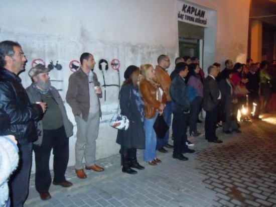 It is rather weird to go through the quarter by night around the Selemiye Mosque all by yourself, occasionally you meet a cat playing with an empty tin. I went to attend the opening of ESKI, a new venue in one of the side streets around the mosque, just behind the sort of antiquity shop. It was dark, and I thought I was wrong, but then I saw a crowd of people standing in the road, attentively listening to a voice sounding through the emptiness; it was Aliye Ummanel, introducing with philosophical words the new art venue ESKI behind her. It was like theatre. She gave the word to Umay Yilmaz as first young artist to officially lift the ‘iron curtain’ in the true meaning of the word because it is the aim to offer an open space for use by young artists, writers, actors and performers. With warm words Umay waved the guests in: Come in, follow me, this is it; and we followed her into an inner courtyard, the courtyard of a former hardware shop, Aliye explained. Lights were dimmed, I felt a shudder creep up my spine: a space where the past had been enclosed for a long time.