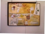 Powerful they are and every space of the canvas is in proper balance with each other, and the colours are well set and telling. She has thoroughly worked on the texture of the canvas and it goes perfectly well with the theme of her project: The history of writing. The message does not end at the rim of the paintings, it is continued on the rough wooden frames, or fractions of frames, in true continuation of the composition and glued to it traces the past has left behind: the story does not end here, she wants to say. In her paintings, on the rough structure, she used all sorts of tools, even her fingers, to leave marks, her own marks, and, she said, I mostly used pure colours at one time and worked over them with another layer. I am very impressed.